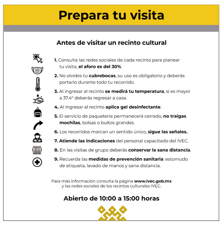 De manera responsable, invitamos al público a visitar de nuevo los recintos del IVEC siguiendo las indicaciones correspondientes. Les damos la más cordial bienvenida y sugerimos que, para planear su visita, consulten las medidas de prevención en www.ivec.gob.mx y las redes sociales de cada espacio cultural.