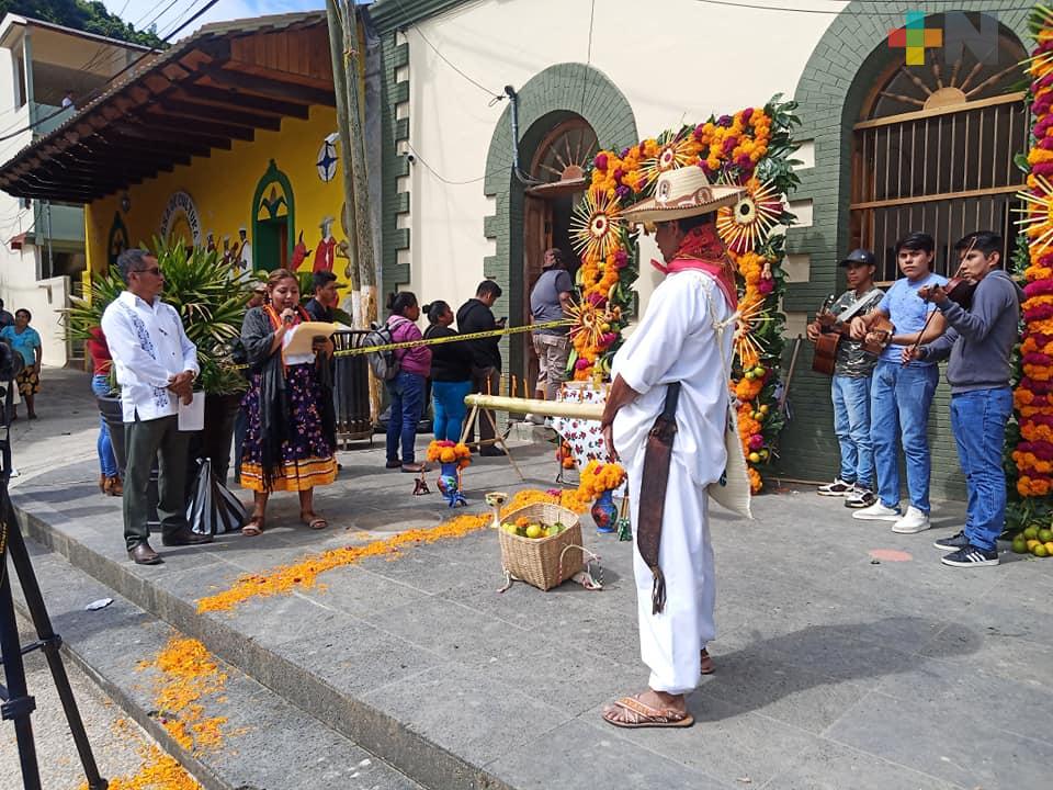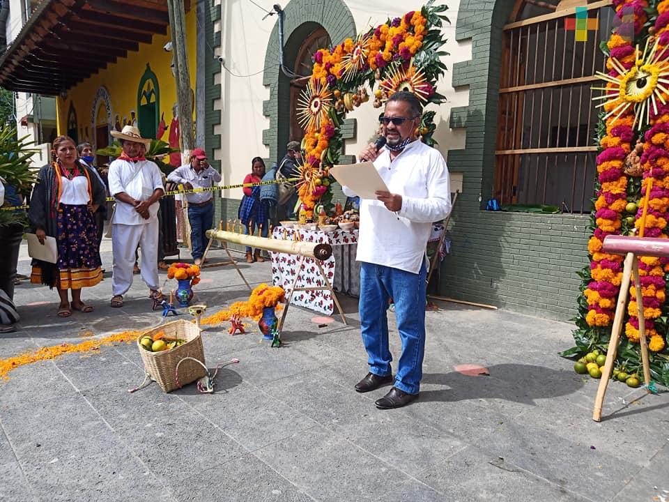 Con una muestra de altar en el quiosco de la cabecera municipal, con las fotos, comida, atole, tamales, café, bebidas, mole, frutas, pan, chocolate, incienso, ceras, veladoras, altar adornado con papel de china, flores de cempasúchil, uña de gato, dulces de calabaza, danza tradicional de mujeres con blusas bordadas, ramos de flores, palmas, incensarios.