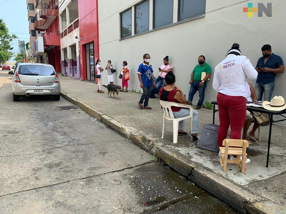 Coatzacoalcos, Ver.- Al igual que en las largas filas para comprar cerveza, en bancos de Coatzacoalcos también hay filas pero para recibir el apoyo económico de las Tandas para el Bienestar del gobierno federal por la pandemia de COVID-19.