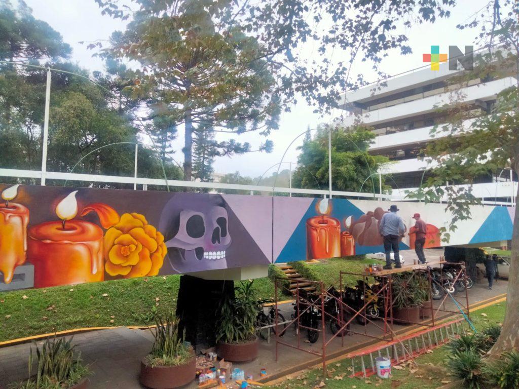 Un mural de grafiti con íconos de la mexicanidad y altares de muerto con flor de cempasúchil adornan desde este martes el puente que da ingreso a esta dependencia estatal.