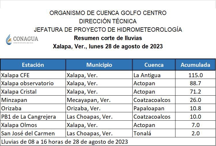 Resumen de #Lluvias acumuladas de 8 a 16 horas registradas por estaciones climatológicas de #Conagua en #Veracruz. Datos del 28 de agosto 2023
