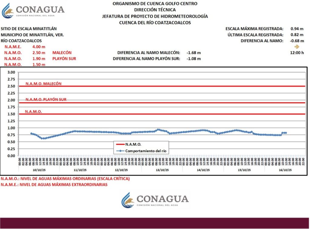 Coatzacoalcos, Ver.- En la actualización del mediodía de este jueves, por parte de la Comisión Nacional del Agua, organismo de cuenta Golfo-Centro, el río Coatzacoalcos presenta niveles por debajo de su nivel de desbordamiento en la zona de Minatitlán.