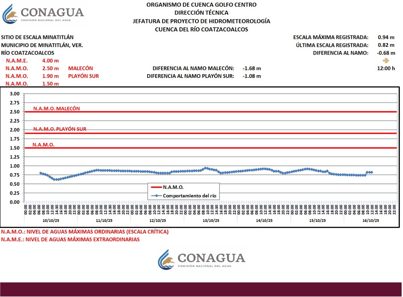 Coatzacoalcos, Ver.- En la actualización del mediodía de este jueves, por parte de la Comisión Nacional del Agua, organismo de cuenta Golfo-Centro, el río Coatzacoalcos presenta niveles por debajo de su nivel de desbordamiento en la zona de Minatitlán.
