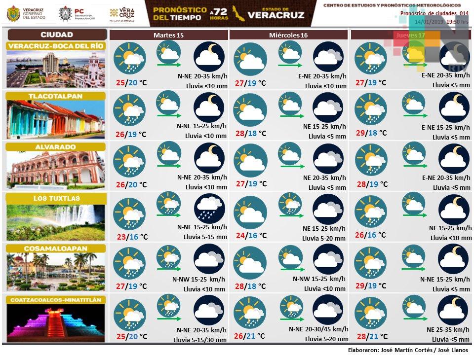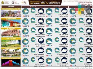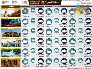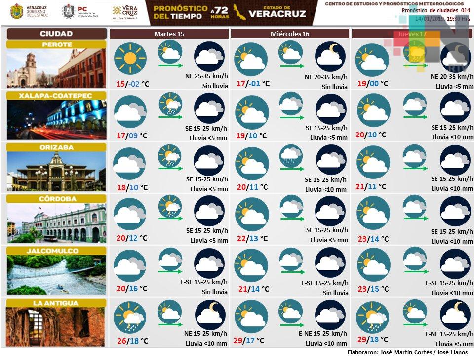 Xalapa, Ver.- De acuerdo al pronóstico de la Secretaría de Protección Civil, en los próximos tres días se esperan condiciones para lloviznas y lluvias dispersas de tipo ligero, disminuyendo la temperatura máxima este martes e incrementándose a partir del miércoles; no obstante se mantendría ambiente frío a fresco por la noche-madrugada con heladas en zonas serranas.