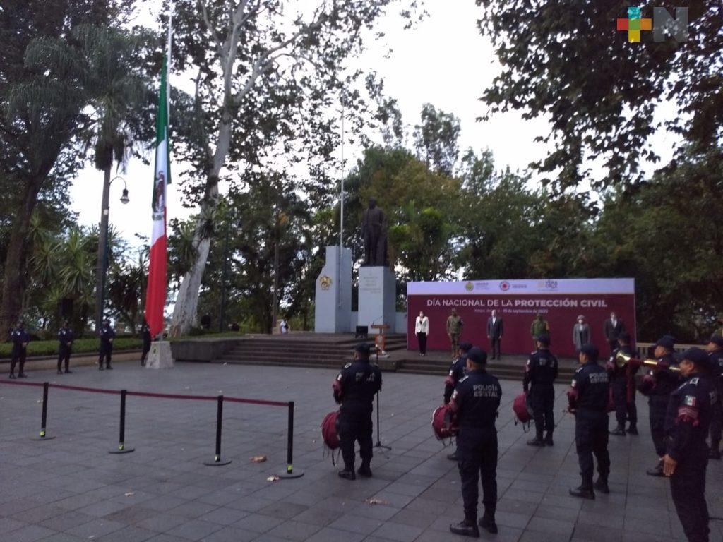 Xalapa, Ver.- La Bandera Nacional a media a hasta y el sonar de las sirenas enmarcaron la ceremonia del Día Nacional de la Protección Civil, que en Xalapa estuvo encabezada por el gobernador Cuitláhuac García Jiménez.