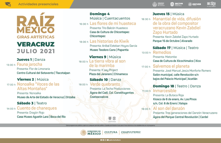 La programación comenzó el pasado sábado 19 de junio y continuará hasta el próximo 18 de julio, contando con presentaciones de música, teatro, títeres y danza que se realizarán en espacios públicos, escuelas y casas de cultura de la entidad veracruzana, con estricto apego a las indicaciones del semáforo epidemiológico.