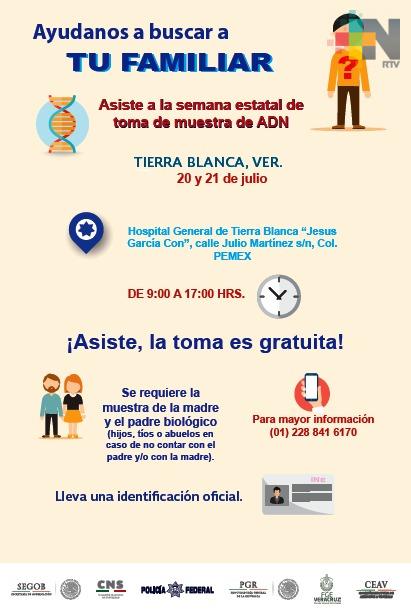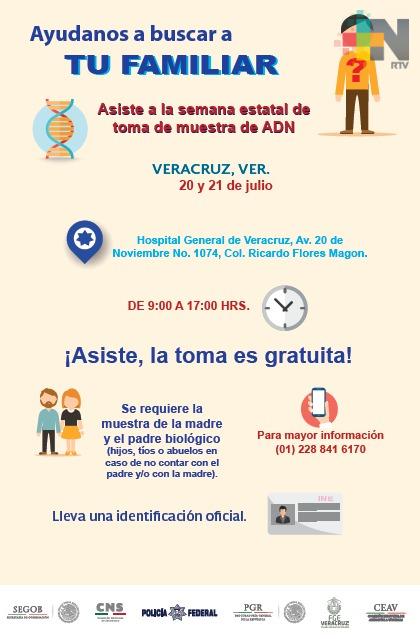 Xalapa, Ver.- En continuación con las Jornadas de Toma de Muestras de ADN, con las cuales la división Científica de la Policía Federal y la Fiscalía General del Estado, a través de la Fiscalía Especializada para la Atención de Denuncias por Personas Desaparecidas, coadyuvan con la recolección gratuita de muestras, a integrarse en Carpetas de Investigación.
