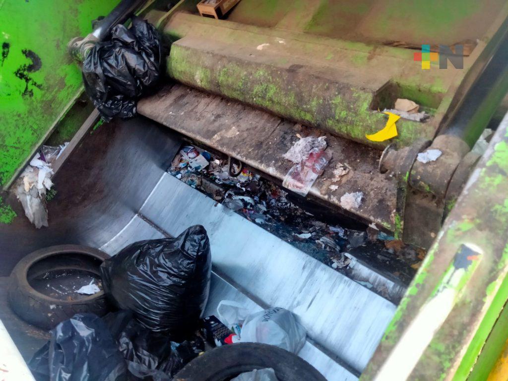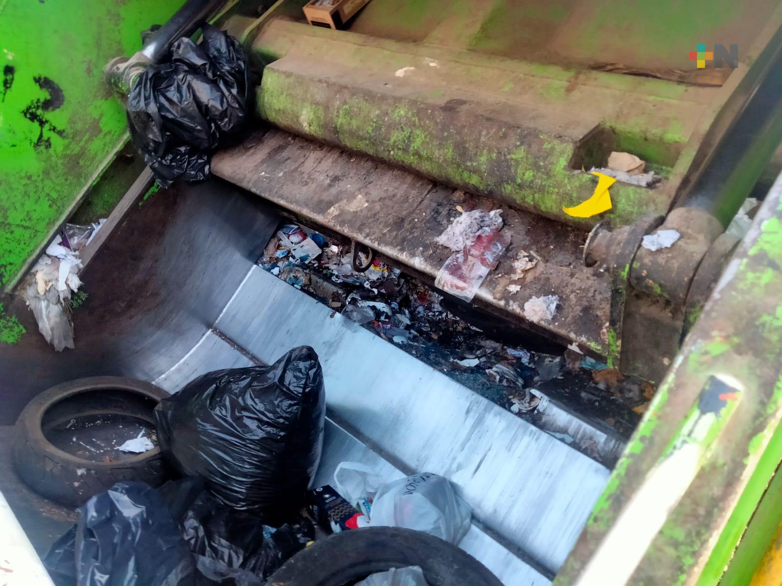 “Adentro tiene un disco que conforme se va llenando, se va recorriendo hacia atrás. Ese proceso es para compactar la basura, aquí él está moviendo las palancas, va a bajar la tapa, va a volver a hacer la operación de las palancas y va a bajar la basura, adentro tiene un compactador grande que conforme va sacando la basura, el disco se va jalando para atrás para ir llenando”, indicó Alejandro Bello Bonifacio, ayudante Limpia Pública de Xalapa.
