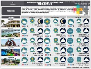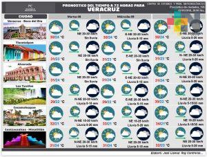 La circulación de un anticiclón sobre el Golfo de México y una débil vaguada sobre la Sonda de Campeche favorecen el aporte de aire cálido y húmedo al estado hacia gran parte de la Vertiente Oriental donde los efectos de la orografía, el calentamiento diurno y difluencia en niveles superiores de la atmósfera apoyan el desarrollo de nublados con lluvias en gran parte del estado de Veracruz, previendo que estas continúen en el transcurso de esta tarde-noche sobre regiones montañosas y zona sur, además de nieblas y lloviznas.