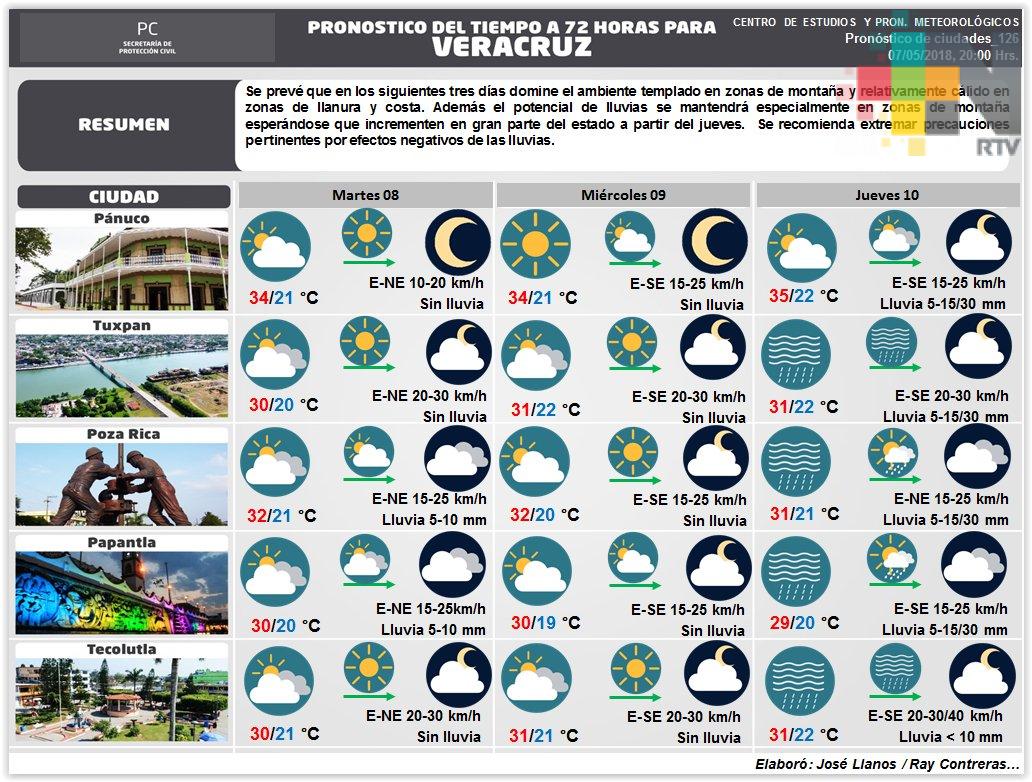 La circulación de un anticiclón sobre el Golfo de México y una débil vaguada sobre la Sonda de Campeche favorecen el aporte de aire cálido y húmedo al estado hacia gran parte de la Vertiente Oriental donde los efectos de la orografía, el calentamiento diurno y difluencia en niveles superiores de la atmósfera apoyan el desarrollo de nublados con lluvias en gran parte del estado de Veracruz, previendo que estas continúen en el transcurso de esta tarde-noche sobre regiones montañosas y zona sur, además de nieblas y lloviznas.