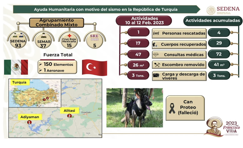 En su participación en la conferencia de prensa matutina brindada por el presidente López Obrador este lunes en Palacio Nacional también dio a conocer que los rescatistas aztecas han recuperado cuerpos de 29 personas acaecidas entre los escombros de las edificaciones derrumbadas tras el sismo registrado en Turquía.