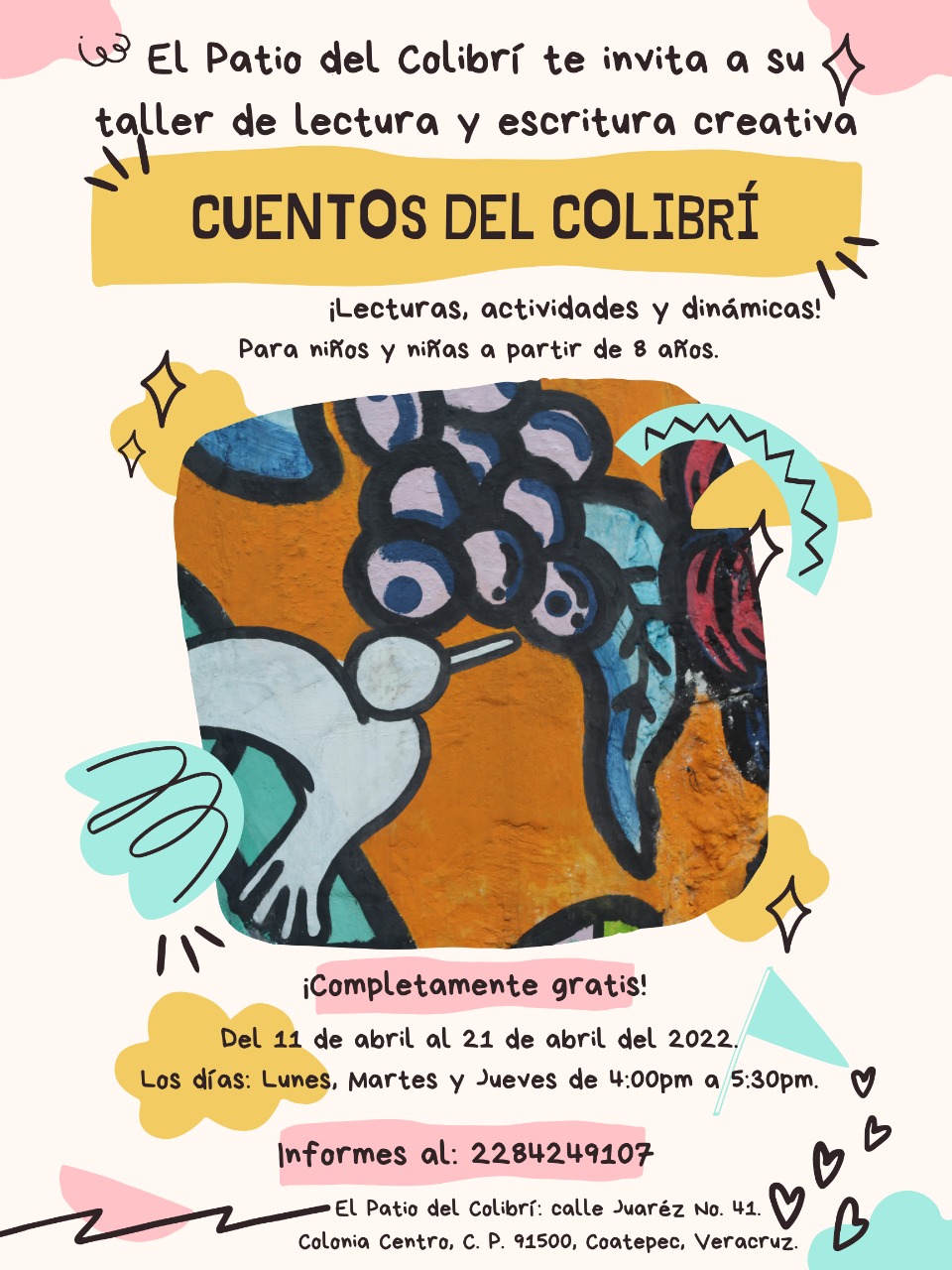 El primer taller que da inicio a las actividades culturales de “El Patio del Colibrí” es el nombrado “Cuentos del colibrí”. El taller tendrá duración de dos semanas, desde el 11 tu hasta el 21 de abril.