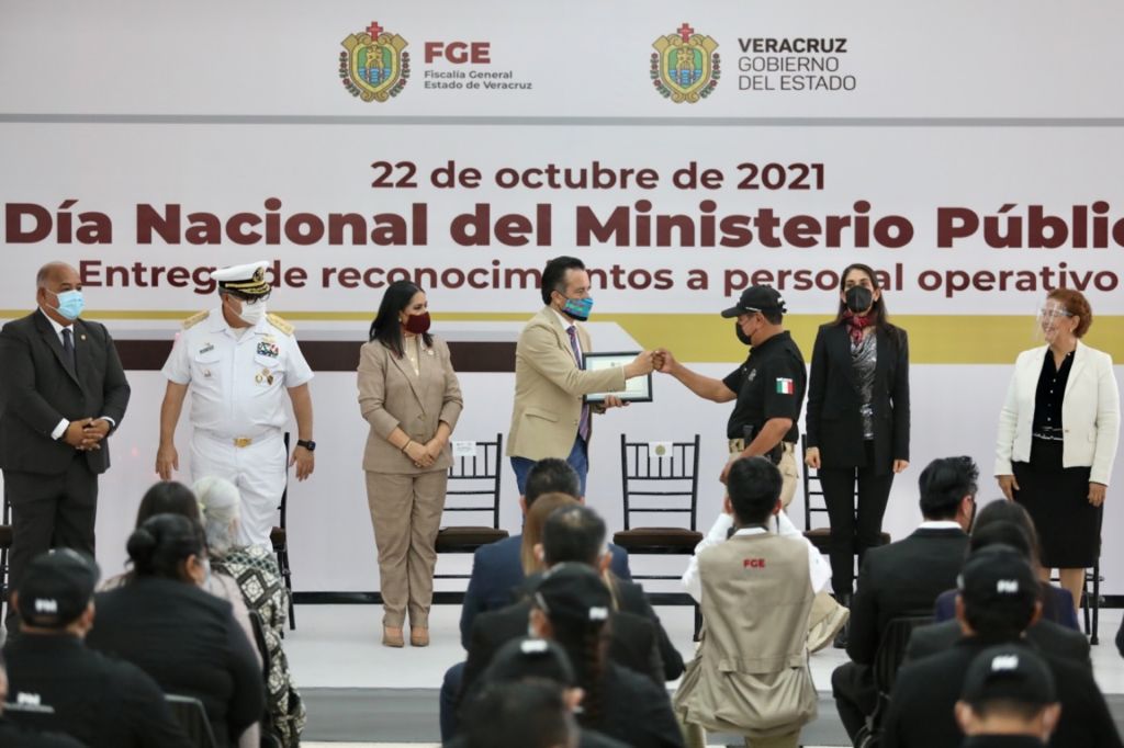 Por primera vez en el estado se otorgaron medallas a dos agentes de Policía Ministerial por acciones heroicas y distinciones póstumas a tres caídos en el cumplimiento del deber. “Del Ejecutivo estatal tenemos apoyo desde el inicio de la gestión y hemos respondido con hechos y resultados. Con los tres poderes hay plena coordinación; como nunca antes, las instituciones trabajan por transformar a Veracruz con justicia”, aseguró la titular de la FGE, Verónica Hernández Giadáns.