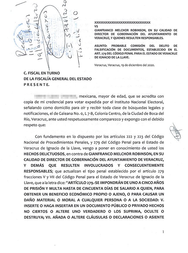 Veracruz, Ver.- Por el supuesto delito de falsear una acta de residencia a favor de Miguel Ángel Yunes Márquez y éste pueda aspirar a ser candidato a alcalde del puerto de Veracruz, el director de Gobernación de la administración actual del ayuntamiento porteño, Gianfranco Melchor Robinson, fue denunciado penalmente ante la Fiscalía General del Estado.