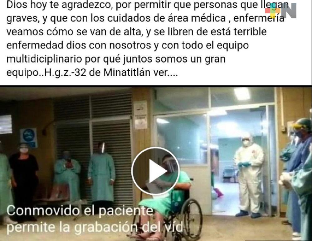 Minatitlán, Ver.- Entre aplausos fue dado de alta el primer paciente con COVID-19 del Hospital General de Zona 32 del Instituto Mexicano del Seguro Social (IMSS) de Minatitlán.