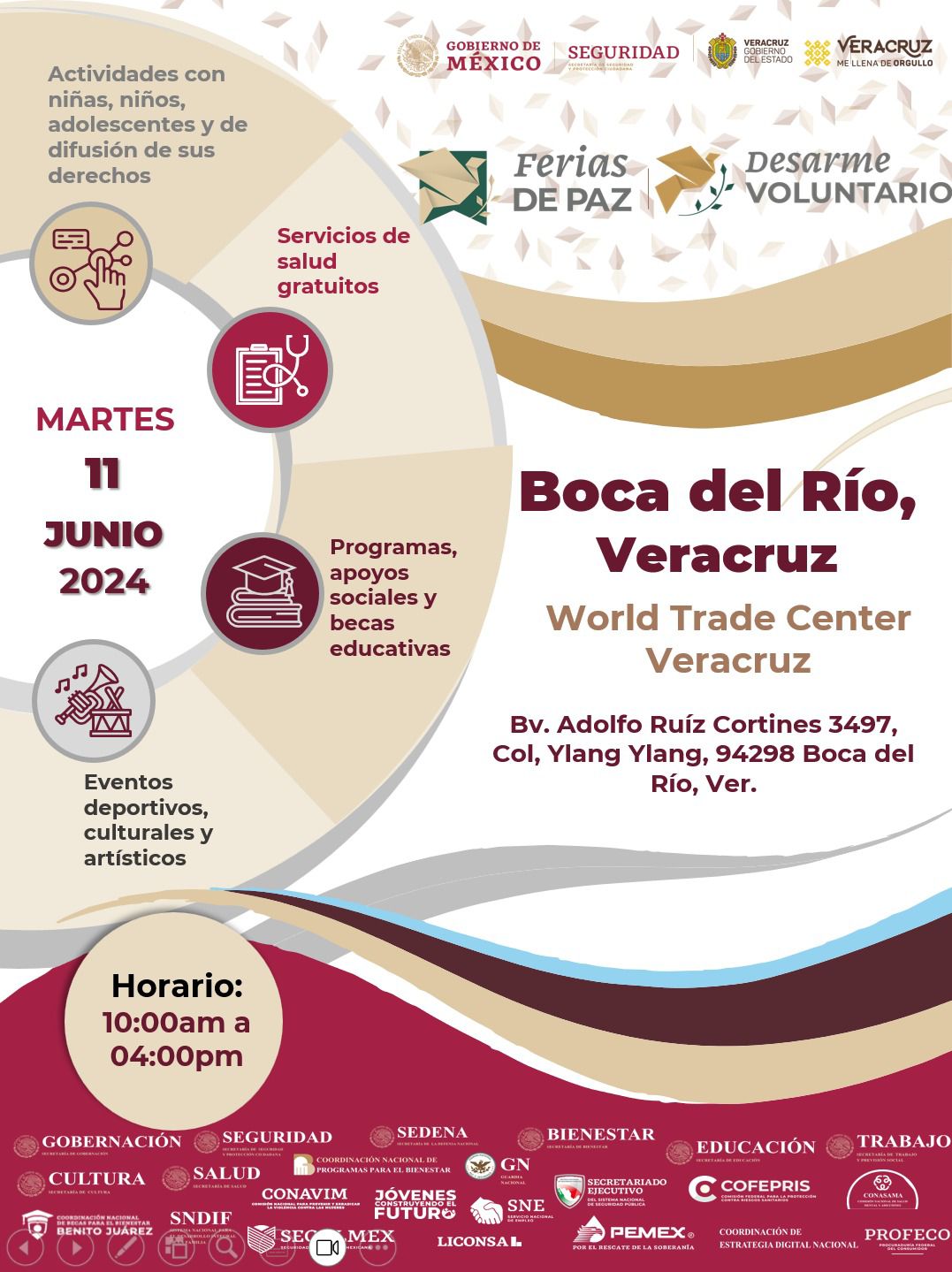 Xalapa, Ver.- El gobierno de Veracruz invita a participar en la Feria de Paz y Desarme Voluntario 2024, estrategia que lleva a cabo la Secretaría de Seguridad y Protección Ciudadana, del Gobierno Federal, a fin de promover valores y comportamientos que rechacen la violencia y las causas que la originan.