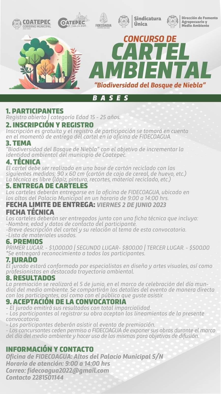 En tanto, Ana Karen Novoa Rodríguez, gerente general de Fidecoagua, dio a conocer la convocatoria del concurso del cartel que tiene como tema «Biodiversidad del Bosque de Niebla”, con el objetivo de incrementar la identidad ambiental del municipio de Coatepec.