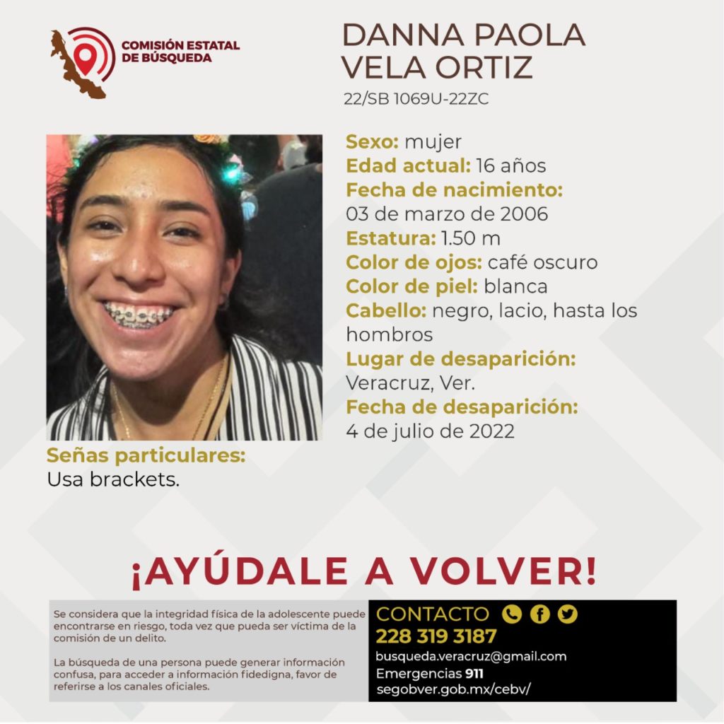 Se trata de Danna Paola Vela Ortiz, quien fue vista por última vez durante el recorrido a la altura de la Playa Villa del Mar, en el puerto de Veracruz.