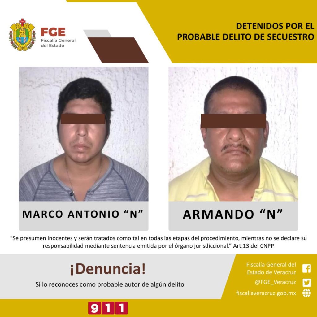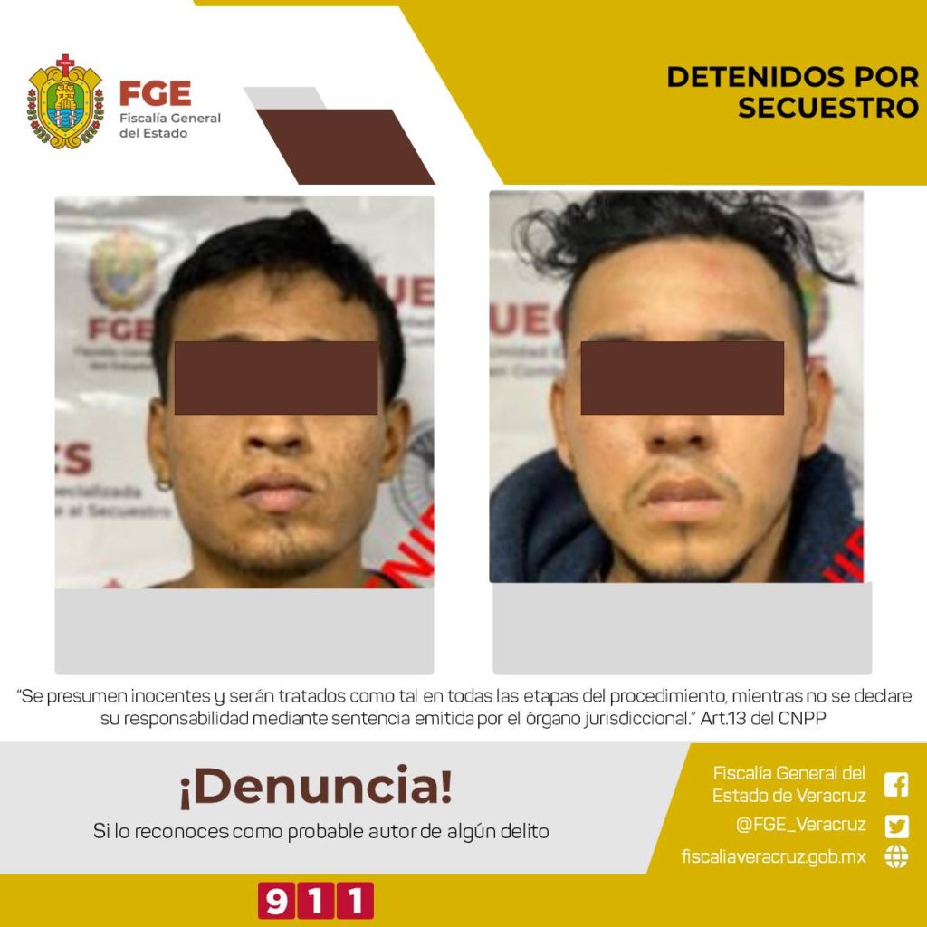 Por otra parte, la UECS con sede en la zona centro Xalapa, en coordinación con elementos de la Guardia Nacional, de la Coordinación Nacional Antisecuestro (Conase) y Fuerza Civil, detuvo en flagrancia del delito de secuestro a Emmanuel “N” y David “N”, presuntos integrantes del mismo grupo delictivo.
