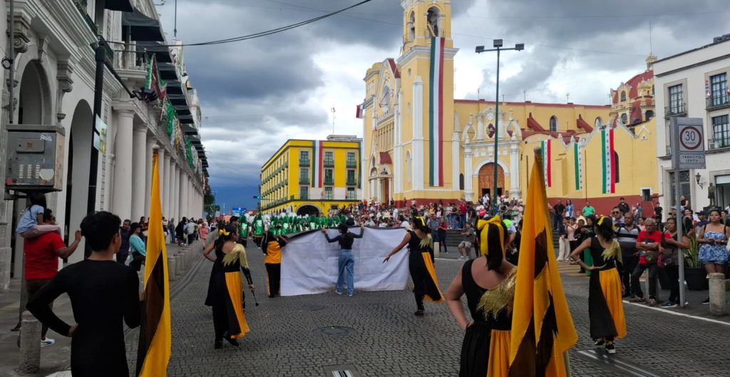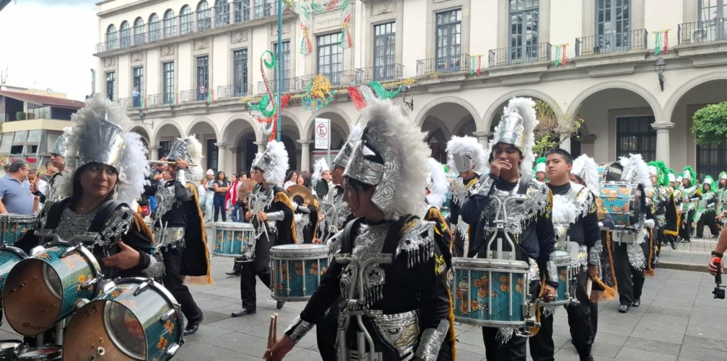 Desfile de bandas en centro de Xalapa por aniversario de Secundaria Técnica 105