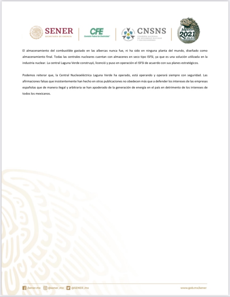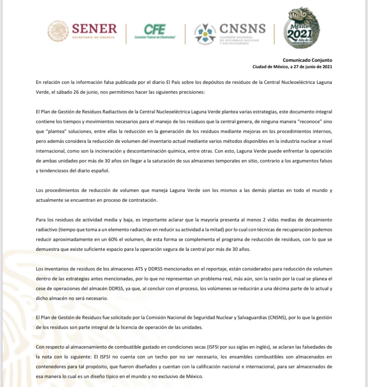 A través de sus redes sociales y mediante una carta, la CFE precisó la situación actual con como opera la planta nucleoeléctrica ubicada en el estado de Veracruz: