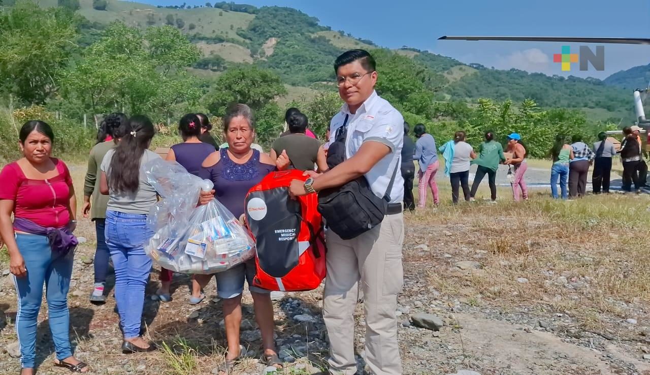 El personal de la Secretaría de Salud entregó una mochila de primeros auxilios y una bolsa con medicamentos, preguntando si hay personas con urgencia de traslado y al descartarse esta necesidad, el helicóptero vuelve al aeropuerto para seguir trasportando ayuda a la población de la sierra norte del estado afectada por la vaguada y depresión tropical 90E desde ya más de diez días.