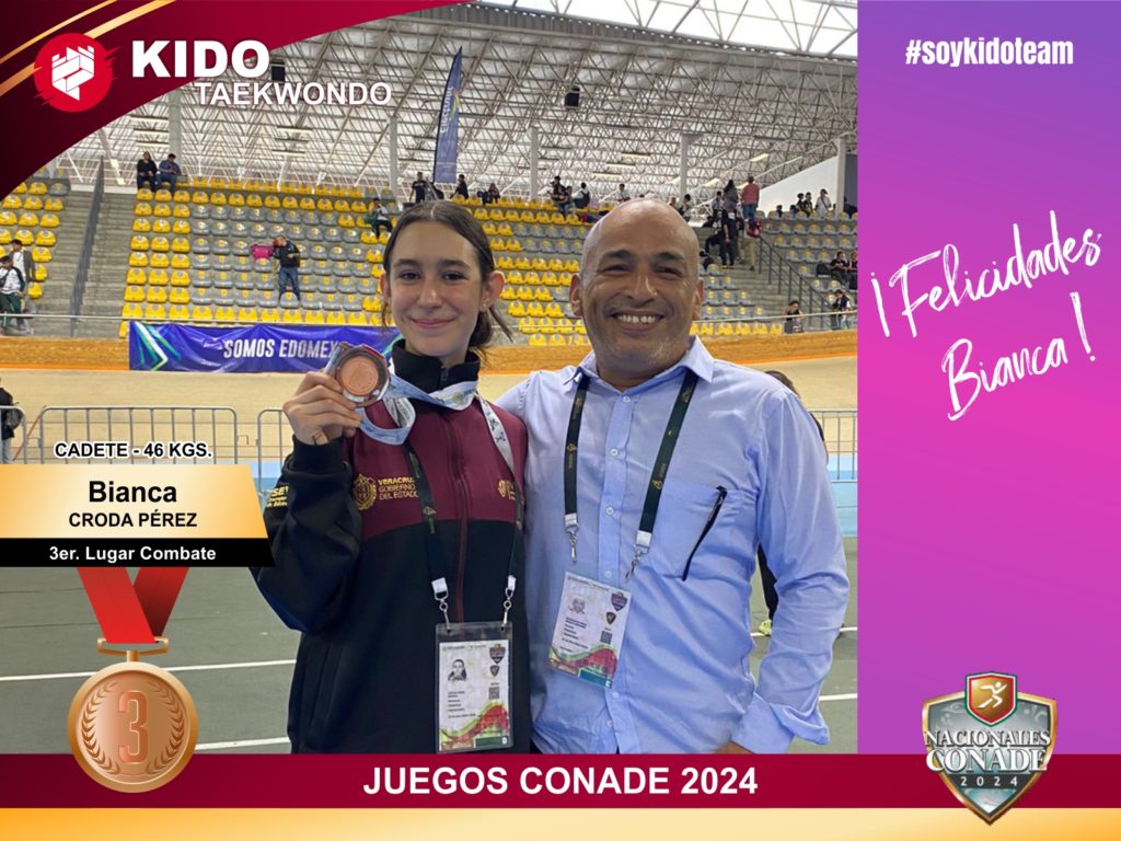Veracruz, Ver.– La organización KIDO Taekwondo se congratula y felicita a los taekwondoines y seleccionados por Veracruz, Bianca Croda Pérez y Christopher Reyes Romero por su participación y resultados obtenidos en los Juegos Nacionales Conade 2024 efectuados en Guadalajara, Jalisco.