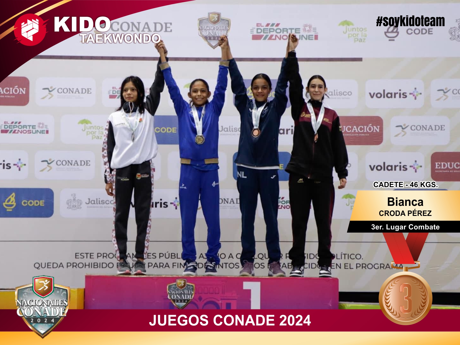 Bianca Croda Pérez registró exitosa participación, alcanzando el podio y situándose entre las mejores tres atletas del país en su categoría, ganando medalla de bronce en la modalidad de combate, categoría cadete femenil, de menos 44 kilogramos.