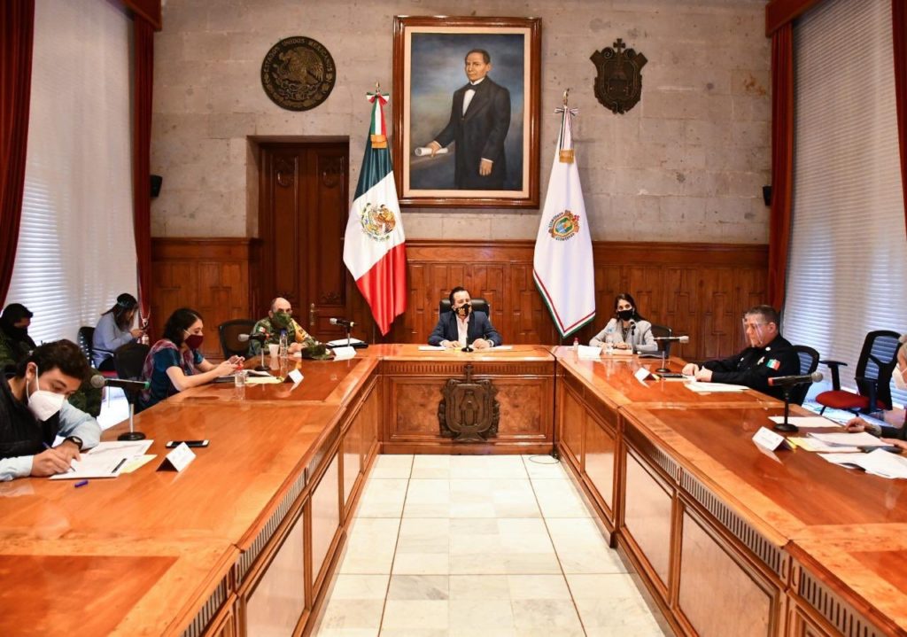 En la reunión realizada en el Palacio de Gobierno estuvieron presentes la fiscal Verónica Hernández Giadáns y el secretario de Seguridad Pública, Hugo Gutiérrez Maldonado, así como la secretaria de Protección Civil, Guadalupe Osorno Maldonado.
