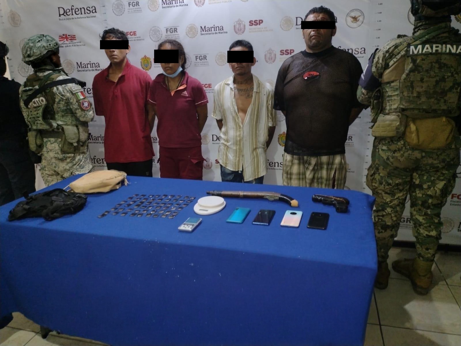 En Coatzacoalcos, en tres eventos diferentes se logró lo siguiente: la detención de cuatro personas por delitos contra la salud, asegurándose 55 dosis de una sustancia con las características del cristal, una réplica de arma corta, un arma de fuego larga (hechiza), dos básculas grameras y cuatro equipos celulares; además, fueron detenidas tres personas por delitos contra la salud, a quienes les decomisaron 40 dosis de una sustancia con las características del cristal. Y fue detenido un masculino por portación ilegal de arma de fuego, asegurándosele un arma tipo revólver y seis cartuchos útiles.