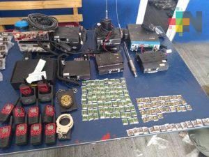 También, 32 placas balísticas, 23 chalecos tácticos, siete uniformes pixelados, nueve camisolas verde olivo, dos pantalones Kali, cinco playeras polo con las iniciales CJNG, ocho juegos de coderas y rodilleras tácticas, 18 perneras con porta cargador, 17 cascos Kevlar, 42 gorras, 34 pasamontañas, cinco parches con las iniciales CJNG, tres parches con la bandera nacional, 10 radios portátiles marca Midland, una pila de radio portátil, dos bases de carga para radio portátil Kenwood, 10 módulos de radiofrecuencia, una antena de radio, un módem y un porta credencial de la Procuraduría General de Justicia de Veracruz.