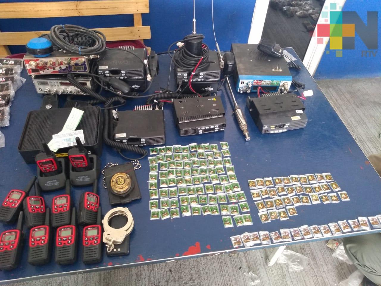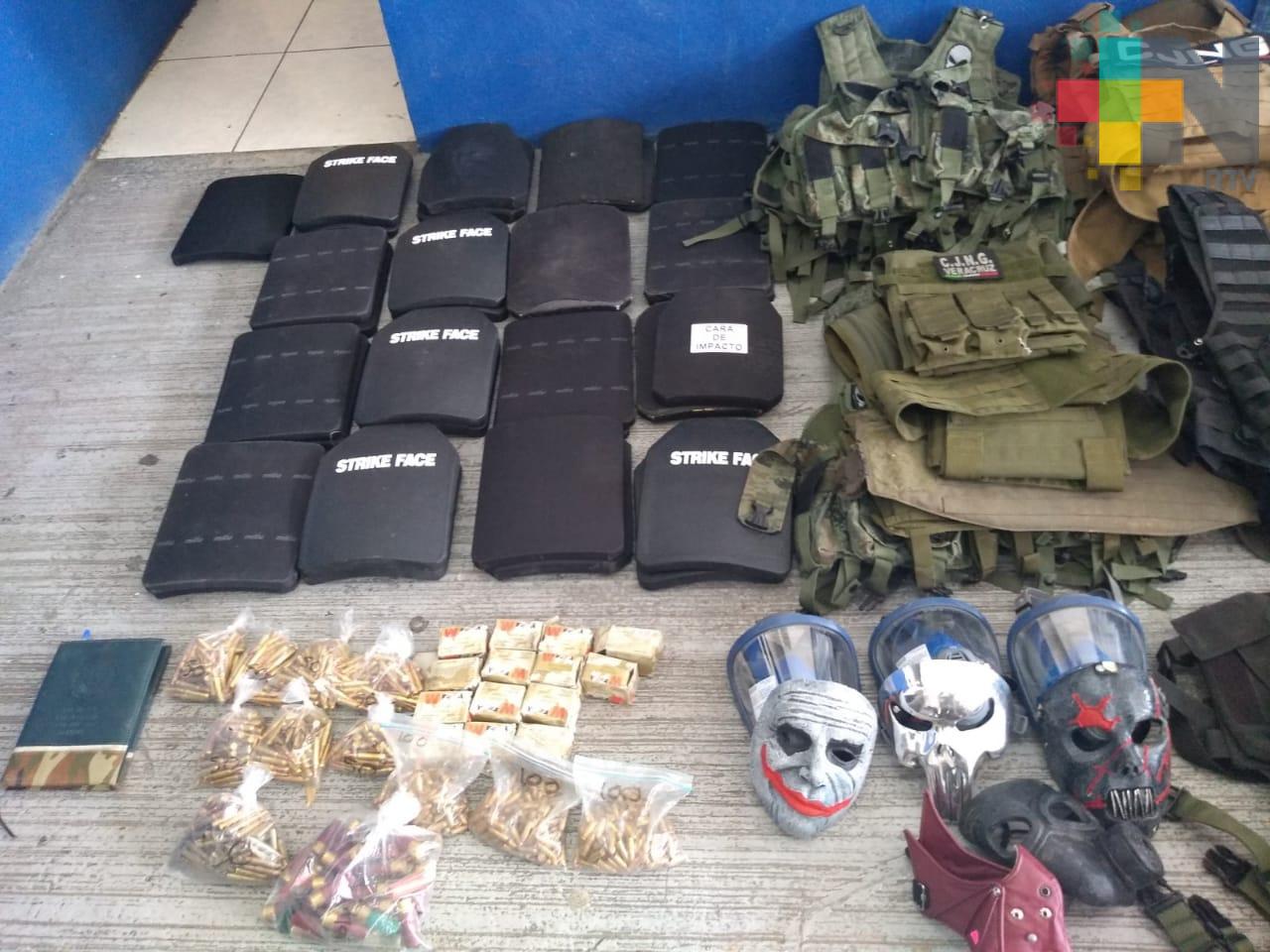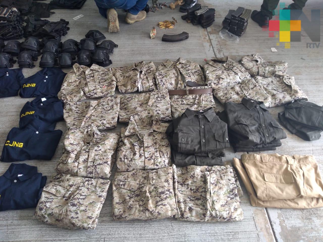 También, 32 placas balísticas, 23 chalecos tácticos, siete uniformes pixelados, nueve camisolas verde olivo, dos pantalones Kali, cinco playeras polo con las iniciales CJNG, ocho juegos de coderas y rodilleras tácticas, 18 perneras con porta cargador, 17 cascos Kevlar, 42 gorras, 34 pasamontañas, cinco parches con las iniciales CJNG, tres parches con la bandera nacional, 10 radios portátiles marca Midland, una pila de radio portátil, dos bases de carga para radio portátil Kenwood, 10 módulos de radiofrecuencia, una antena de radio, un módem y un porta credencial de la Procuraduría General de Justicia de Veracruz.