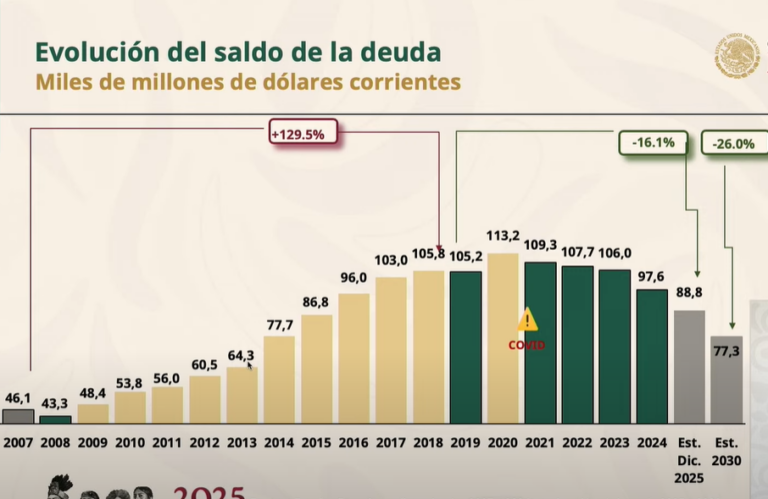 Además, estimó Hacienda, si se mantiene la tendencia a la baja para 2030 el saldo de la deuda llegaría a disminuir hasta 26 por ciento.