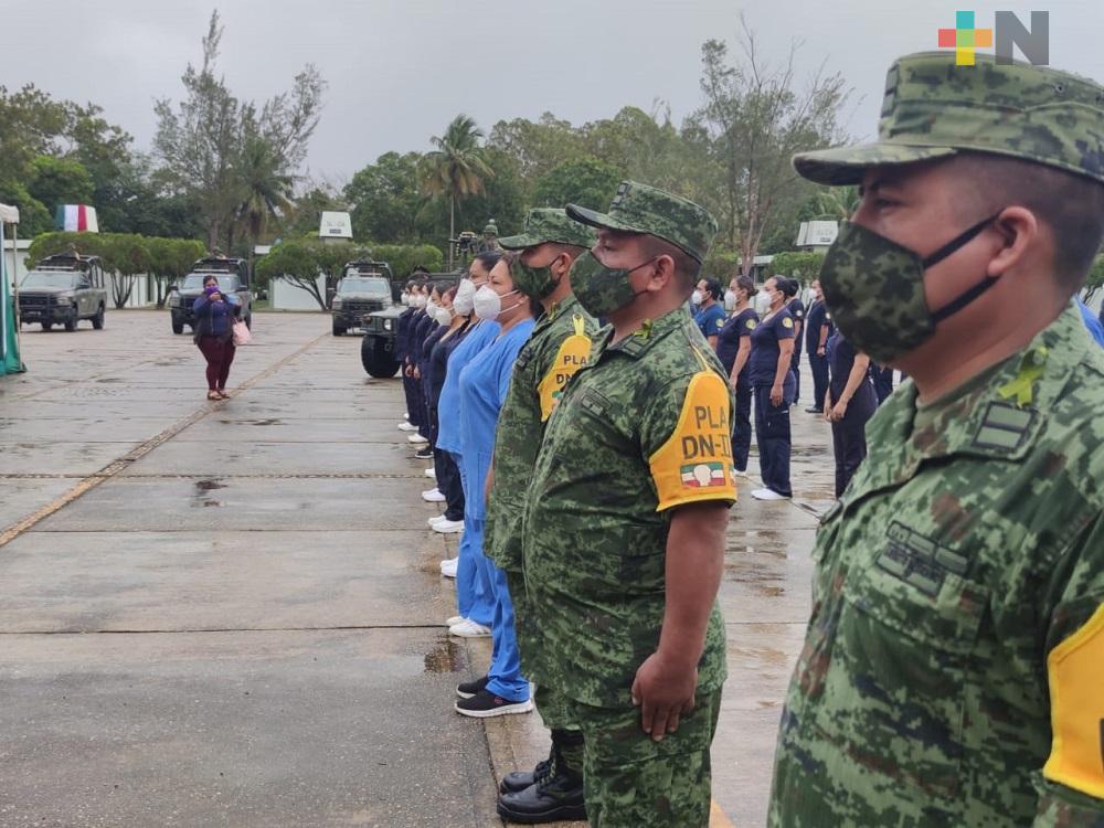 Minatitlán, Ver.- Durante la ceremonia conmemorativa por el Día del Ejército Mexicano, la Unidad de Terapia Intensiva y Hospitalización del 45 Batallón de Infantería con sede en Minatitlán, fue galardonado con la condecoración “Miguel Hidalgo” en grado placa por sus esfuerzos ante la contingencia sanitaria por COVID-19.