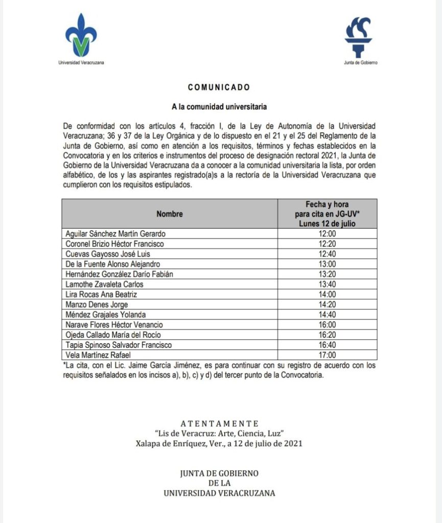 Xalapa, Ver.- A través de un comunicado, integrantes de la Junta de Gobierno de la Universidad Veracruzana, dieron a conocer a los 13 aspirantes que continuarán con su registro como lo establece la convocatoria para ocupar la rectoría de la máxima casa de estudios.