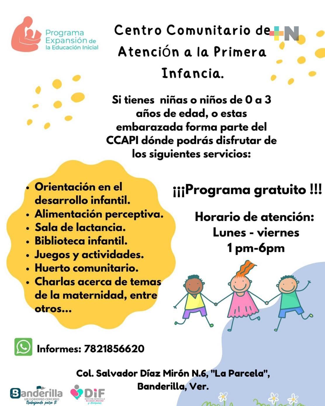 Banderilla, Ver.- El DIF municipal y el Centro Comunitario de Atención a la Primera Infancia (CCAPI) de Banderilla invitan a los padres de familia que tengan niñas o niños de 0 a 3 años de edad, o embarazadas para formar parte del CCAPI en donde podrán disfrutar sin costo alguno de los diversos servicios que se ofrecen, informó Elizabeth López Alonso, procuradora municipal de la Defensa de los Niños y Niñas.