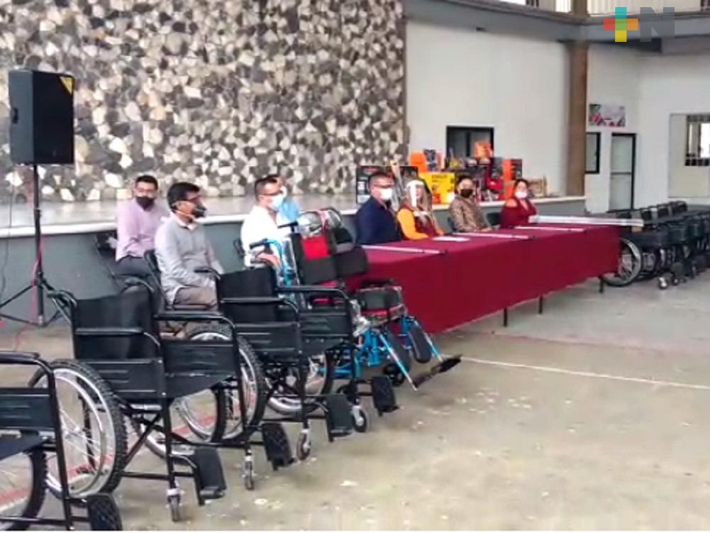 Parte de los beneficiarios de DIF recibieron de manera simbólica, sillas estándar para adultos y una especial, bastones, muletas, un equipo completo para un taller de carpintería, así como despensas para habitantes de la congregación Sierra de Agua.