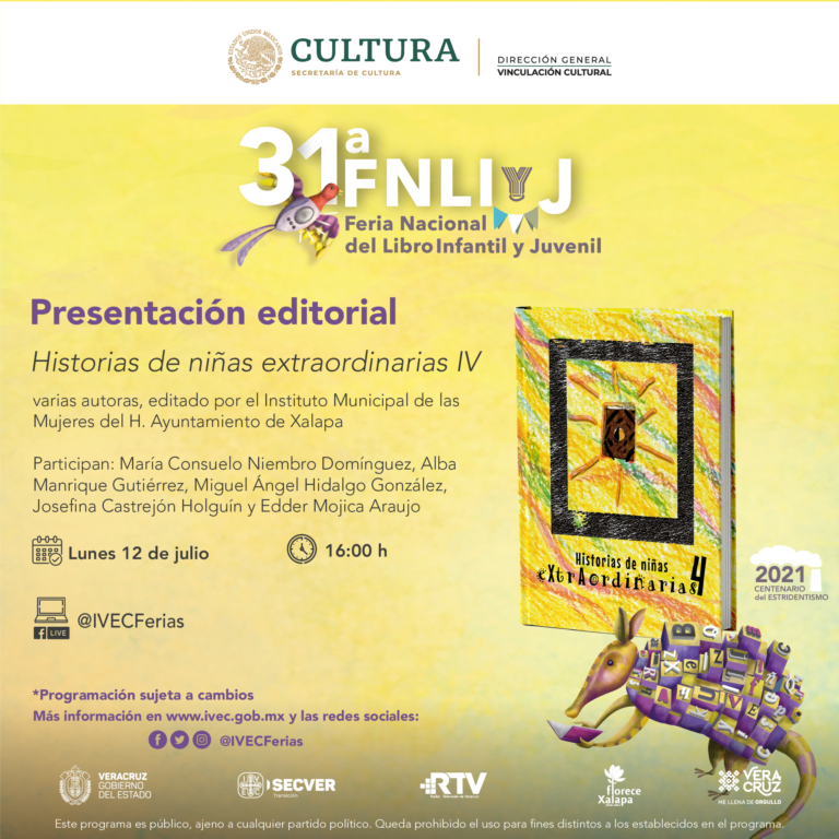 También se llevarán a cabo las presentaciones editoriales de la cuarta y quinta edición de Historias de niñas extraordinarias, volúmenes editados por el Instituto Municipal de las Mujeres del H. Ayuntamiento de Xalapa, mismos que compilan las historias de las niñas y adolescentes que participaron en el concurso literario del mismo nombre; el tomo IV consta de 36 cuentos y el tomo V, de 35, narraciones que abordan temas como la desigualdad, la COVID-19 y la violencia de género.