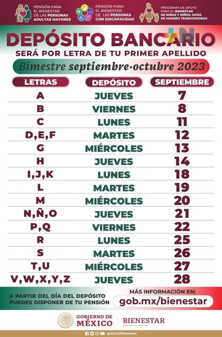 En las fechas del 7 al 28 de septiembre las personas beneficiadas obtendrán su apoyo por 4 mil 800 pesos, el cual corresponde el bimestre septiembre-octubre 2023.