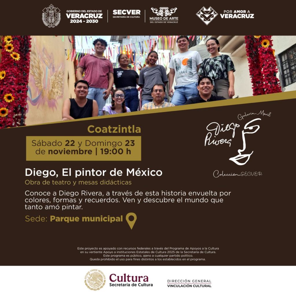 Xalapa, Ver.- La Secretaría de Cultura de Veracruz (SECVER), en colaboración con el ayuntamiento de Coatzintla, invita a conocer la Galería Móvil 2025: Diego Rivera, la cual estará instalada en el parque municipal hasta el próximo 25 de noviembre.