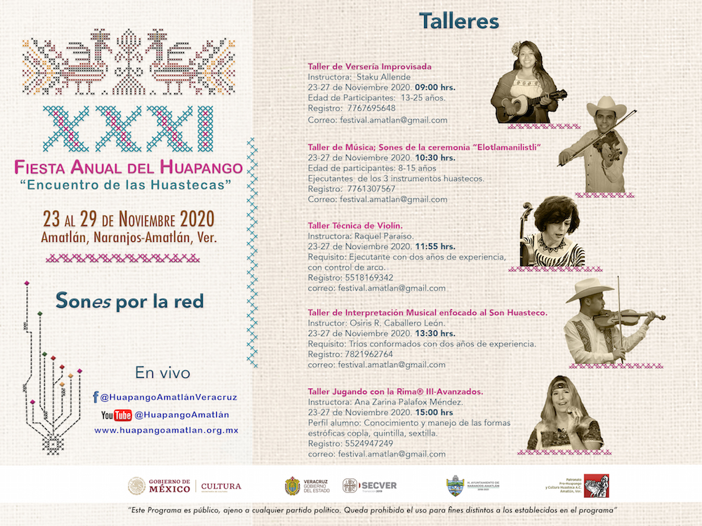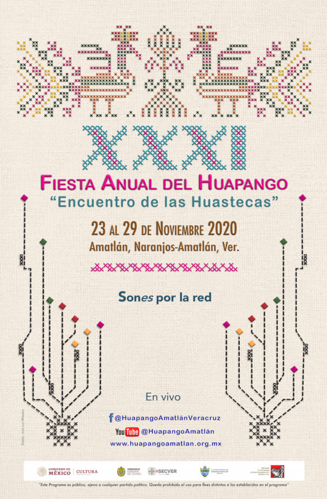 Veracruz, Ver.- El Patronato Pro-Huapango y Cultura Huasteca A.C. de Amatlán-Naranjos, con el apoyo del Instituto Veracruzano de la Cultura (IVEC) y la Secretaría de Cultura federal, a través del Programa de Apoyo a Festivales Culturales y Artísticos PROFEST 2020, realiza la XXXI Fiesta Anual del Huapango “Encuentro de las Huastecas” de Amatlán, a desarrollarse en modalidad virtual del 23 al 29 de noviembre.