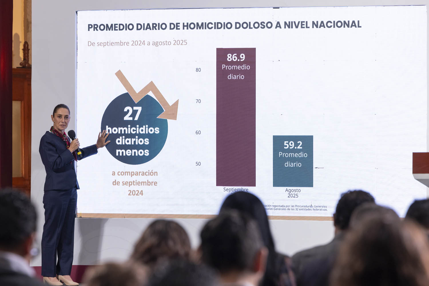 Ciudad de México.- De septiembre de 2024 a agosto de 2025, el promedio diario de homicidios dolosos ha disminuido 32 por ciento en México, al pasar de 86.9 a 59.2 casos diarios, informó Marcela Figueroa, titular del Secretariado Ejecutivo del Sistema Nacional de Seguridad Pública (SESNSP).