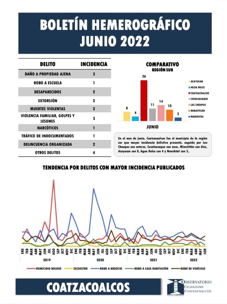 En un comparativo con otras ciudades del sur de Veracruz, Coatzacoalcos ocupó el primer lugar en la lista de municipios con más incidencia delictiva al detectar 36 delitos de diferente índole.