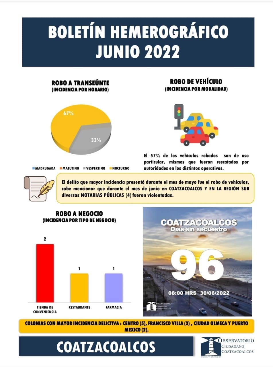 Coatzacoalcos, Ver.- El robo de negocios disminuyó un 20 por ciento en Coatzacoalcos durante el mes de junio y con respecto a mayo, informó en su reporte mensual el Observatorio Ciudadano de Coatzacoalcos (OCC).