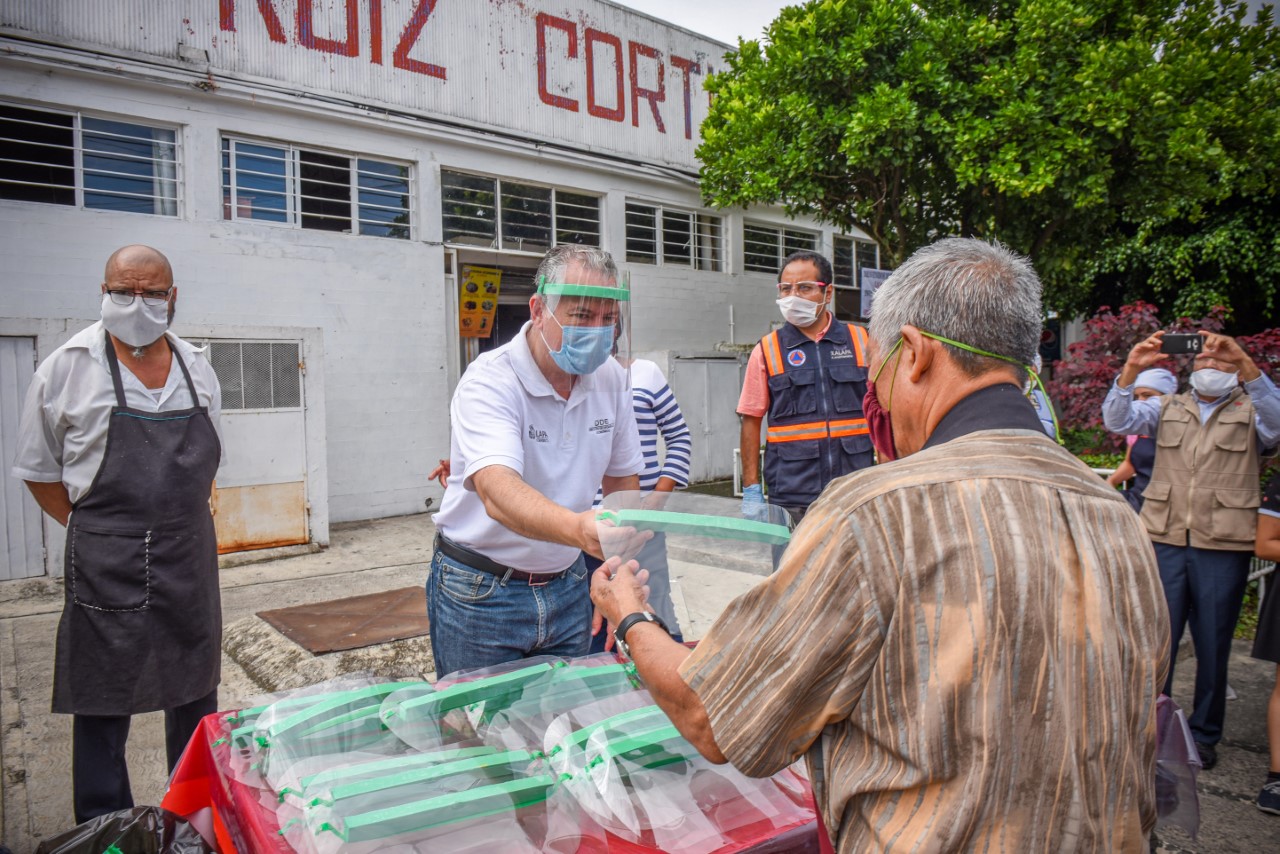 Xalapa, Ver.- Para reforzar las medidas de protección y de prevención de la enfermedad COVID-19 en mercados, tianguis y plazas, personal de las direcciones de Desarrollo Económico y Protección Civil municipal entregaron 200 caretas a locatarios del mercado Adolfo Ruiz Cortines, La Rotonda.