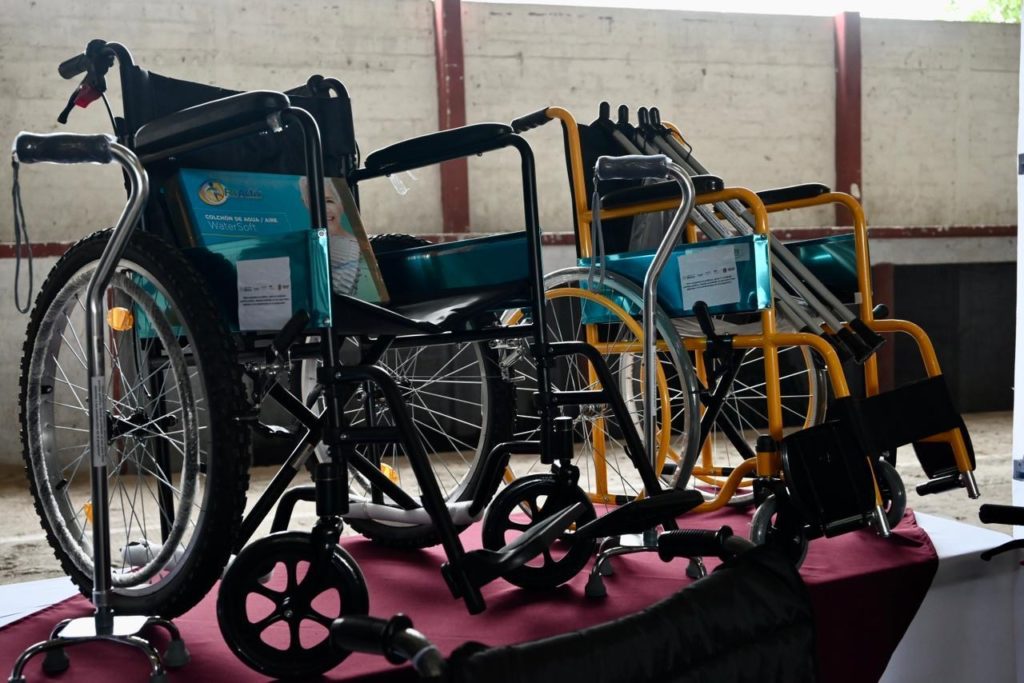 La entrega incluyó sillas de ruedas estándar para adultos e infantiles, dispositivos para personas con parálisis cerebral infantil (PCI), sillas de ruedas para personas con sobrepeso, cojines de cuatro puntos, bastones de puño alemán y axilares, carriolas especiales para PCI, así como colchones de agua y aire, sumando un total de 100 unidades. También se otorgaron cobijas, colchonetas y despensas.