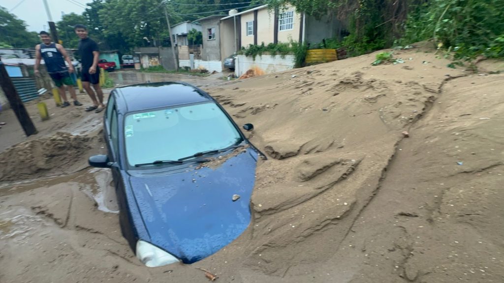 En la calle General Anaya, el cerro a un costado de cientos de viviendas se deslavó y la arena sepultó a un vehículo y una vivienda en la que por fortuna no hubo víctimas que lamentar. Personal de la policía estatal y Obras Públicas arribaron al sitio para apoyar a la población.