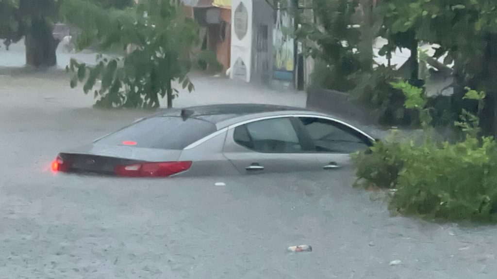 En las vialidades, algunos vehículos quedaron atrapados en los vados de agua formados por las intensas lluvias. Los drenajes colapsaron y taparon las vialidades donde camionetas no vieron los escombros de esta alcantarilla en reparación en la Avenida Uno y un vehículo terminó accidentado.