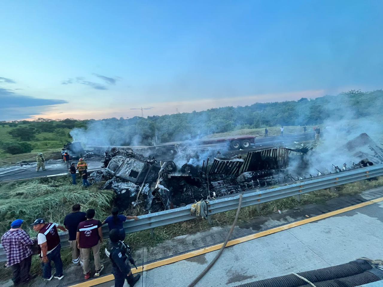 El conductor de un tracto camión tipo caja seca con placas de circulación 20AJ2D, se detuvo de forma repentina, esto al percatarse de la presencia de un retén de la Fiscalía General de la República (FGR) en ese tramo, por lo que el operador de otro tráiler con razón social Egova, tipo plana se impactó por detrás, para después incendiarse ambas unidades en su totalidad.