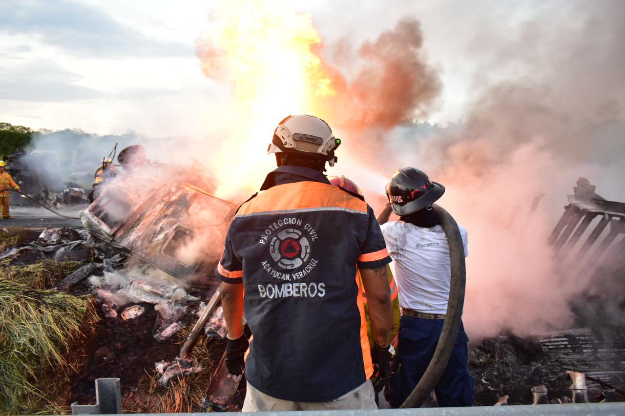 Personal de Caminos y Puentes Federales de Ingresos y Servicios Conexos (Capufe) en coordinación con elementos de Protección Civil de los municipios de Acayucan y de Oluta, acudieron al lugar del siniestro y procedieron a sofocar el fuego, brindando ayuda a Luis Omar Ruiz Himaldo, chofer del tráiler tipo plana, quién resultó fuertemente lesionado por el choque.